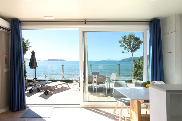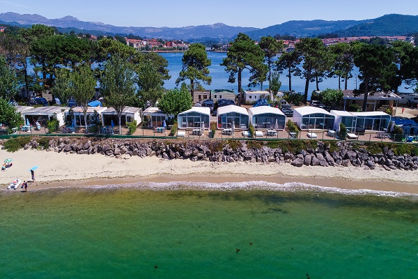 Nuestro camping ocupa una privilegiada península en la bahía de Baiona, por lo que efectivamente disponemos de alojamientos hacia el mar o la marisma en toda su longitud.